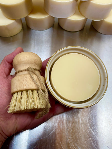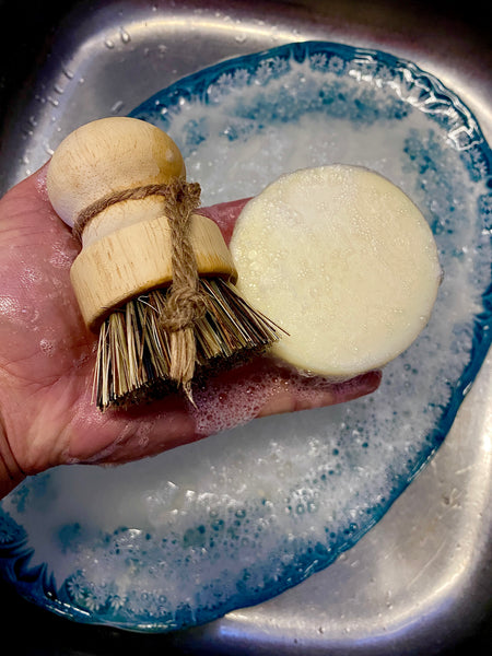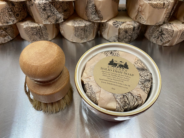 Our non-toxic solid dish soap bars consist of 8 ingredients. Coconut oil, Beef Tallow, Castor Oil, Distilled Water, Citric Acid, Sodium Hydroxide, Orange and Lemon essential oils! This bar offers a squeaky clean lather that leaves your dishes spot free without harsh and toxic chemicals! Plastic free, all natural, lasts forever and comes in a ramekin dish with a bamboo scrubby.